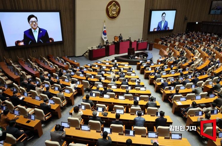 우원식 국회의장이 2일 국회에서 열린 제432회 국회(임시회) 개회식에서 개회사를 하고 있다.