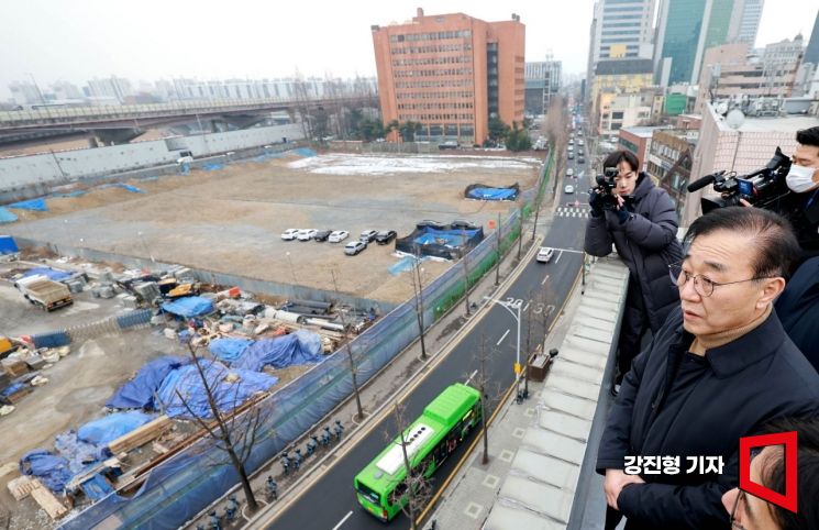 김윤덕 국토교통부 장관이 4일 서울 강남구 한 빌딩에서 1.29대책 관련 주택 사업지인 서울의료원 남측 부지를 현장 방문하고 있다. 한국토지주택공사(LH)가 소유한 삼성동 서울의료원 남측 부지는 518가구가 공급될 예정이다.