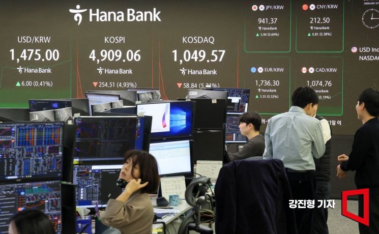 코스피 지수가 장중 5000선을 붕괴하며 나흘 만에 매도 사이드카가 발동된 6일 서울 중구 하나은행 딜링룸에서 딜러들이 업무를 보고 있다.