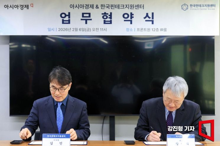 장범식 아시아경제 대표(오른쪽)와 김건 한국핀테크지원센터 이사장이 6일 서울 마포구 프론트원에서 열린 '아시아경제-한국핀테크지원센터, 디지털자산 및 핀테크 산업 협력 업무협약식'에 참석해 협약서에 서명 하고 있다.