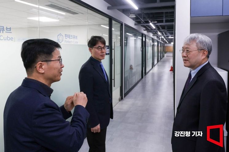 장범식 아시아경제 대표가 6일 서울 마포구 프론트원에서 열린 '아시아경제-한국핀테크지원센터, 디지털자산 및 핀테크 산업 협력 업무협약식'을 마친 뒤 센터 내부를 둘러보고 있다.