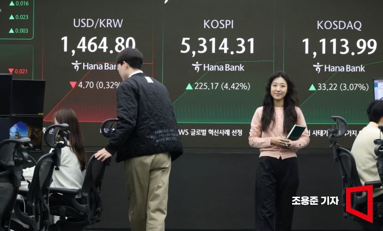 코스피가 4% 넘게 급등 출발한 9일 서울 하나은행 본점 딜링룸에서 직원이 증시와 환율 등을 모니터하고 있다. 이날 코스피는 전 거래일보다 4.13% 오른 5299.10 출발, 역대 최고 시가를 기록했고 코스닥은 2.7% 상승한 1109.91에 개장했다.