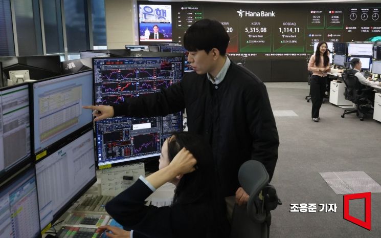 코스피가 4% 넘게 급등 출발한 9일 서울 하나은행 본점 딜링룸에서 직원이 증시와 환율 등을 모니터하고 있다. 이날 코스피는 전 거래일보다 4.13% 오른 5299.10 출발, 역대 최고 시가를 기록했고 코스닥은 2.7% 상승한 1109.91에 개장했다.