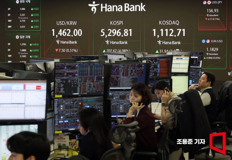 코스피가 4% 넘게 급등 출발한 9일 서울 하나은행 본점 딜링룸에서 직원이 증시와 환율 등을 모니터하고 있다. 이날 코스피는 전 거래일보다 4.13% 오른 5299.10 출발, 역대 최고 시가를 기록했고 코스닥은 2.7% 상승한 1109.91에 개장했다.
