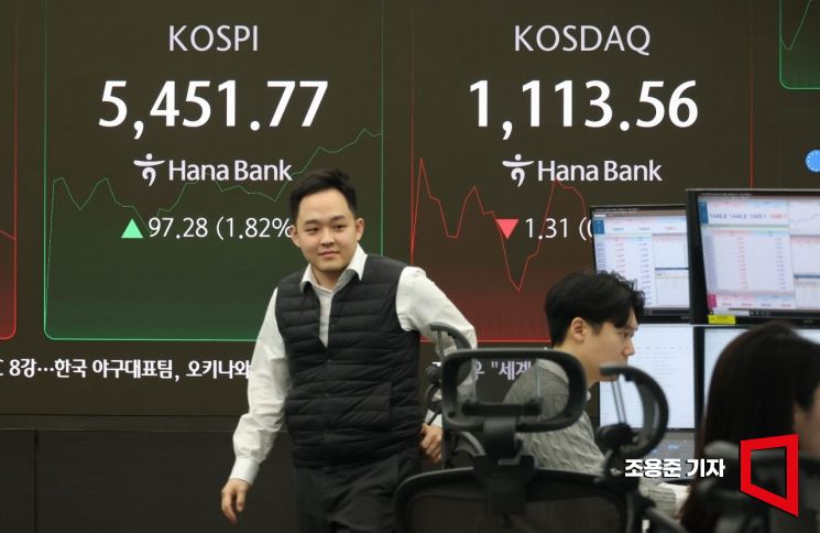 코스피가 장중 사상 최고가를 돌파하며 출발한 12일 서울 하나은행 본점 딜링룸에서 직원이 증시와 환율 등을 모니터하고 있다. 이날 코스피 지수는 전장보다 70.90p(1.32%) 오른 5,425.39에 장을 시작했다.