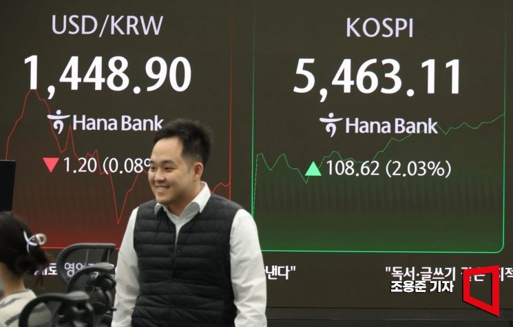 코스피가 장중 사상 최고가를 돌파하며 출발한 12일 서울 하나은행 본점 딜링룸에서 직원이 증시와 환율 등을 모니터하고 있다. 이날 코스피 지수는 전장보다 70.90p(1.32%) 오른 5,425.39에 장을 시작했다.