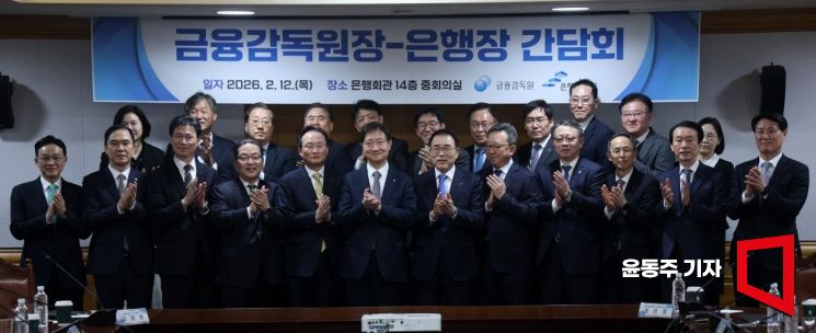 이찬진 금융감독원장이 12일 서울 중구 은행회관에서 열린 은행장과의 간담회에 참석, 참석한 은행장들과 기념촬영을 하고 있다.