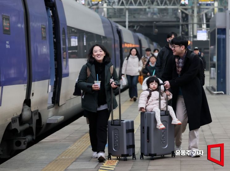 설 명절연휴를 앞둔 13일 서울역에서 귀성객이 고향으로 향하는 KTX열차에 탑승하기 위해 이동하고 있다.