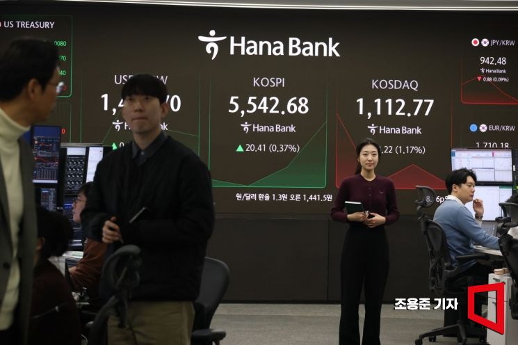 코스피가 장중 5,550선을 돌파 후 보합권을 유지하고 있는 13일 서울 하나은행 본점 딜링룸에서 직원이 증시와 환율 등을 모니터하고 있다. 이날 코스피 지수는 전장보다 0.16% 내린 5513.7에 장을 시작해 시 10분 현재 역대 최고치 5,558.82를 기록했다.