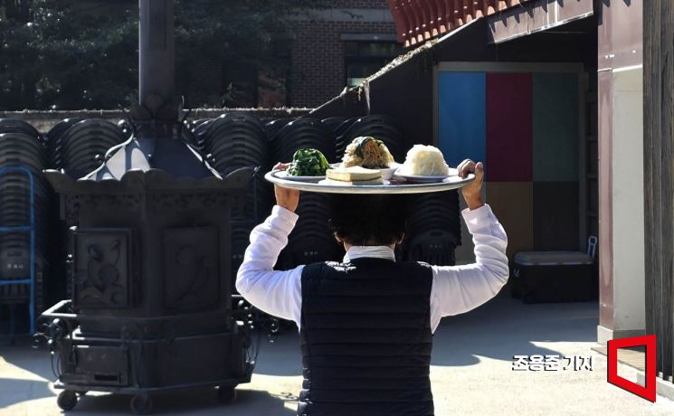 겨울 햇살이 비껴드는 도심의 사찰 마당, 나물과 두부 등 정갈히 담은 쟁반을 머리에 이고 묵묵히 옮기는 발걸음에 정성이 묻어난다. 소박한 음식이지만 공양을 올리기 전의 마음가짐에 흐트러짐이 한점도 없다.(조계사)