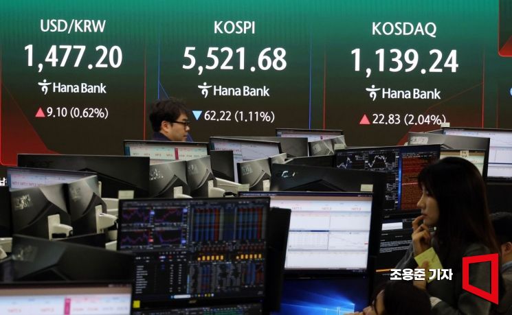 미 뉴욕 3대지수의 하락마감으로 국내 증시도 하락 출발했지만 코스닥은 매도 사이드카가 발동 상승세를 이어간 6일 서울 하나은행 본점 딜링룸에서 직원이 증시와 환율 등을 모니터하고 있다. 이날 코스피는 전 거래일 대비 92.88p(1.66%) 내린 5,491.02으로, 코스닥 지수는 전장보다 1.08p(0.10%) 오른 1,117.49로 원/달러 환율은 전날보다 10.9원 오른 1,479.0원에 장을 시작했다.