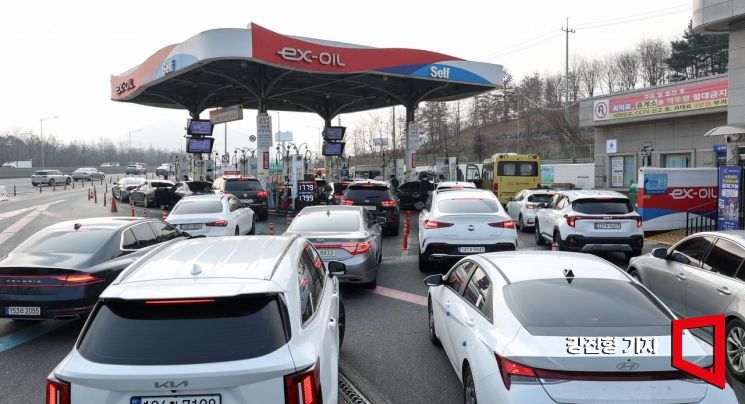 국제 유가가 100달러를 돌파하며 전국 주유소 기름값이 상승하고 있는 9일 서울 서초구 만남의광장 주유소에 기름값이 더 오르기 전에 주유하려는 차들이 줄지어 서 있다.