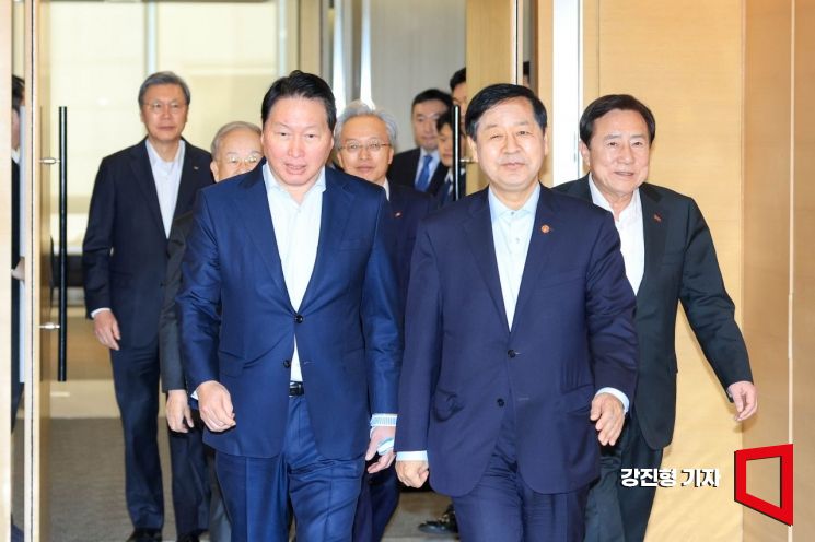 구윤철 경제부총리 겸 재정경제부 장관과 최태원 대한상공회의소 회장을 비롯한 경제단체장들이 12일 서울 중구 대한상공회의소에서 열린 '기업혁신 지원 민관협의체 킥오프회의'에 참석하기 위해 이동하고 있다.