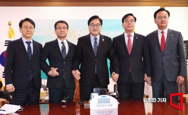 우원식 국회의장이 12일 서울 여의도 국회에서 열린 의장 주재 여야 원내대표 회동에서 기념촬영을 하고 있다. 왼쪽부터 천준호 더불어민주당 원내운영수석부대표, 한병도 원내대표, 우 국회의장, 송언석 국민의힘 원내대표, 유상범 원내운영수석부대표.