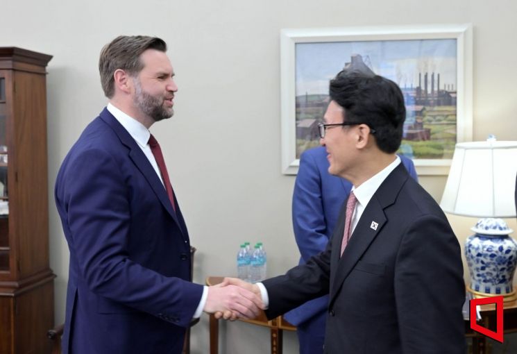 김민석 국무총리가 12일(현지시간) 워싱턴 D.C. 백악관에서 J.D. 밴스(James David Vance) 미국 부통령과 회담에 앞서 기념촬영을 하고 있다. 이번 회담은 지난 1월 밴스 부통령과의 첫 회담 이후 약 50일 만에 다시 개최됐다. [주미한국대사관 제공]