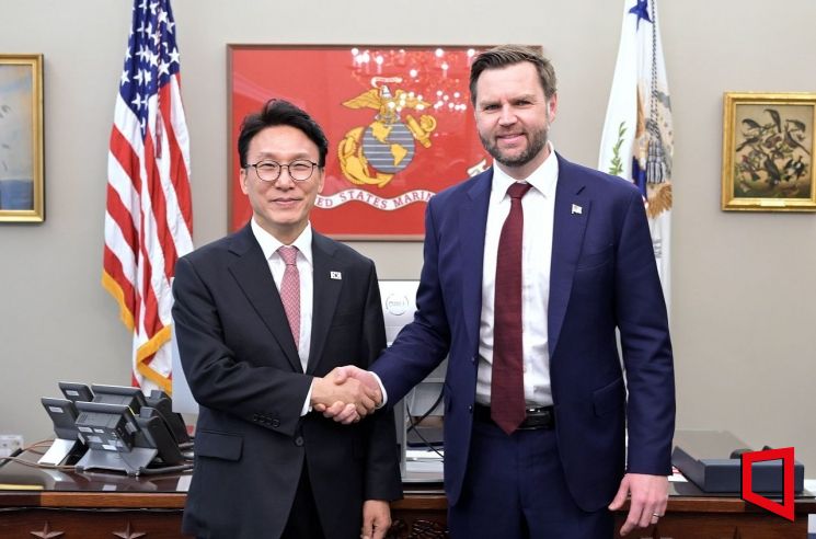 김민석 국무총리가 12일(현지시간) 워싱턴 D.C. 백악관에서 J.D. 밴스(James David Vance) 미국 부통령과 회담에 앞서 기념촬영을 하고 있다. 이번 회담은 지난 1월 밴스 부통령과의 첫 회담 이후 약 50일 만에 다시 개최됐다. [주미한국대사관 제공]