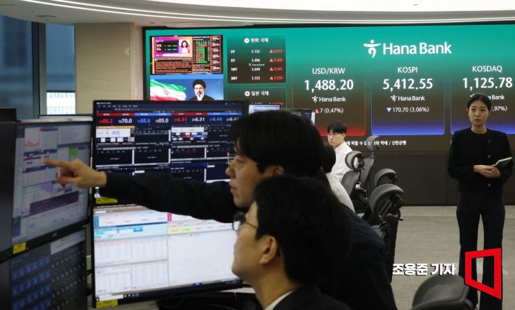 이란의 새 최고지도자가 호르무즈 해협 봉쇄를 이어가겠다는 입장을 밝히면서 미 증시 3대 지수가 일제히 하락 마감한 가운데 국내 증시도 하락출발한 13일 서울 하나은행 본점 딜링룸에서 직원들이 증시와 환율 등을 모니터 하고 있다. 이날 코스피는 전 거래일 대비 3.06% 내린 5412.39 장을 시작했다.