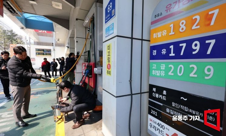 석유 최고가격제 시행 첫 날인 13일 한국석유관리원들이 서울 마포의 한 주유소에서 정량을 확인하고 있다.