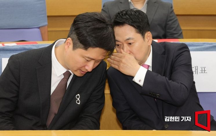 장동혁 국민의힘 대표가 17일 국회 의원회관에서 열린 당 중앙청년위원회·중앙대학생위원회·전국청년지방의원협의회 합동발대식에서 우재준 의원과 대화하고 있다.