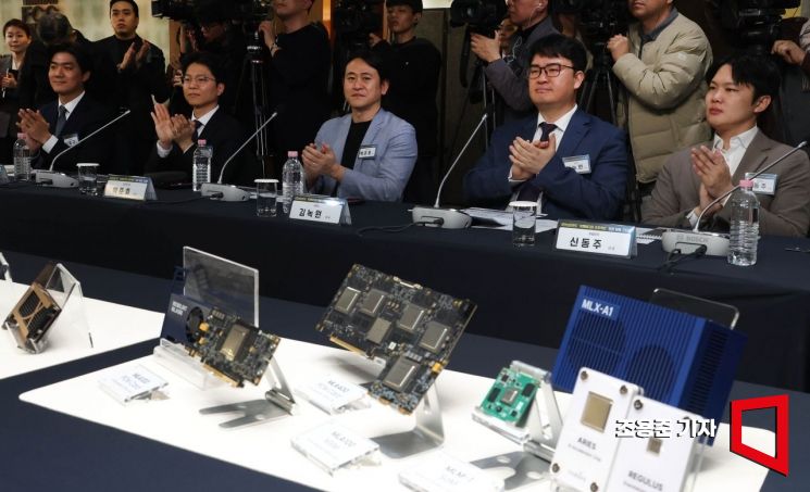 17일 서울 중구 프레스센터에서 열린 국민성장펀드 'K-엔비디아 프로젝트' 민관 합동 간담회에서 AI 반도체 기업 5사 대표들이 배경훈 부총리 겸 과학기술정보통신부 장관의 인사말을 듣고 박수를 치고 있다. 왼쪽부터 신성규 리벨리온 CFO, 김주영 하이퍼엑셀 대표, 백준호 퓨리오사AI 대표, 김녹원 딥엑스 대표, 신동주 모빌린트 대표.