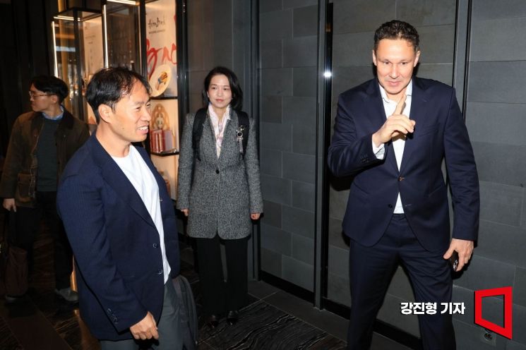 김성훈 업스테이지 대표가 19일 서울 종로구 포시즌스 호텔에서 방한중인 리사 수 AMD 최고경영자(CEO)와 회동 하기 위해 이동하고 있다.