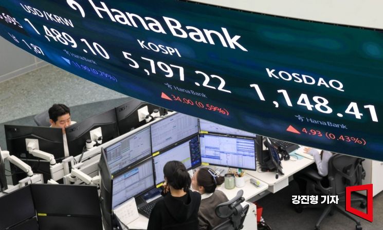 코스피 지수가 전 거래일 대비 50.13포인트 상승한 5813.35로 장을 시작한 20일 서울 중구 하나은행 본점 딜링룸 전광판에 국내증시 현황이 표시돼 있다. 이날 원달러 환율은 전거래일 대비 9원 내린 1492원에 거래를 시작 했다.