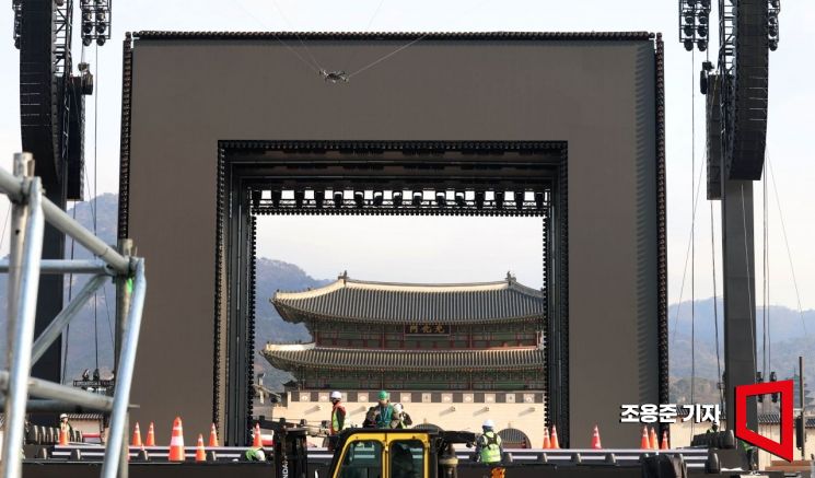그룹 방탄소년단(BTS) 컴백 공연을 하루 앞둔 20일 서울 종로구 광화문광장은 막바지 공연 준비가 한창 진행되고 있다.