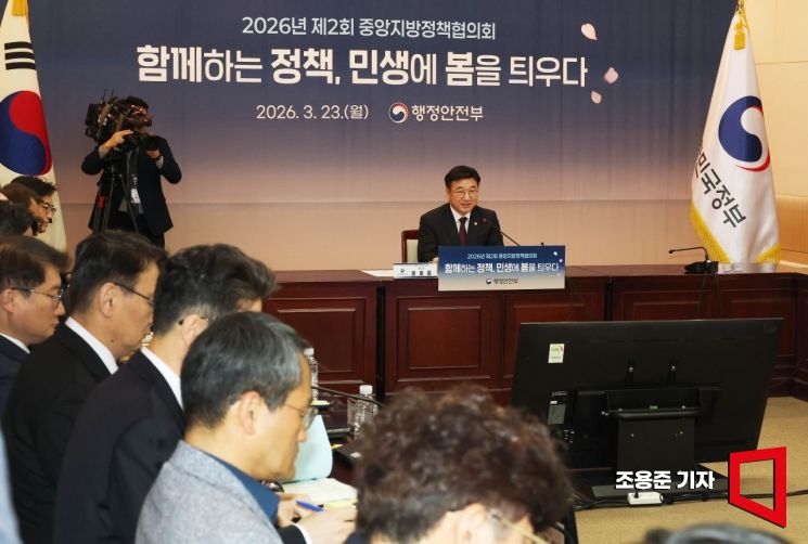 윤호중 행정안전부 장관이 23일 서울 종로구 정부서울청사에서 열린 '2026 중앙지방정책협의회' 전체회의에 참석해 발언하고 있다.