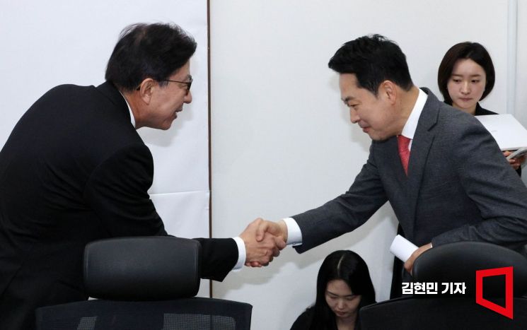 박형준 부산시장이 23일 국회에서 장동혁 국민의힘 대표를 만나 악수하고 있다.