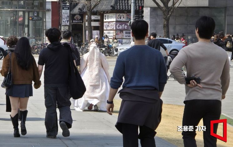 올 봄들어 가장 따뜻한 날씨를 보인 23일 서울 종로 경복궁 일대를 찾은 시민들이 가벼운 옷차림으로 봄을 즐기고 있다.