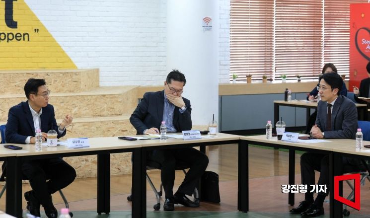 이수연 서울시 경제실장(왼쪽)이 23일 서울 강서구 글로벌마케팅센터에서 열린 '중동 상황 대응 서울시 비상경제대책 기업 간담회'에 참석한 기업인들의 에로사항을 청취 하고 있다.