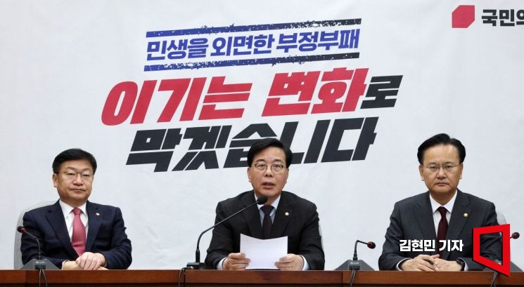 송언석 국민의힘 원내대표가 24일 국회에서 열린 원내대책회의에서 발언하고 있다.