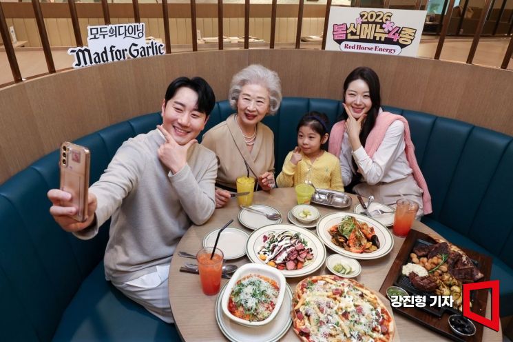 24일 서울 영등포구 매드포갈릭 영등포타임스퀘어점에서 가족 고객들이 매드포갈릭의 2026 봄 신메뉴를 비롯한 다양한 메뉴를 시식하고 있다. 엠에프지코리아(대표 윤다예)가 운영하는 '모두의 다이닝' 매드포갈릭은 2026년 브랜드 슬로건 '매드포패밀리'를 선언하고 본격적인 캠페인을 시작했다.