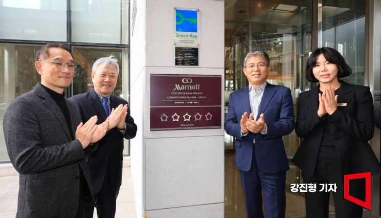 마영민 아시아경제 대표이사(왼쪽부터), 장범식 아시아경제 대표이사 사장, 현상순 아시아경제 회장, 김복례 호텔 총지배인이 24일 서울 메리어트 이그제큐티브 아파트먼트에서 열린 호텔 등급 5성 획득 기념 현판식을 마친 뒤 박수 치고 있다.