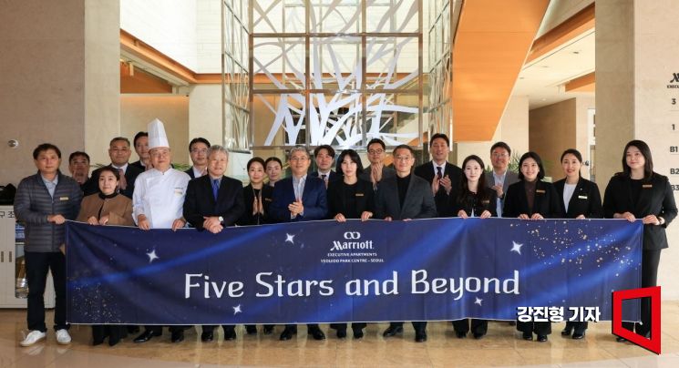 현상순 아시아경제 회장, 장범식 아시아경제 대표이사 사장, 마영민 아시아경제 대표이사를 비롯한 아시아경제 임직원 및 호텔 임직원들이 24일 서울 메리어트 이그제큐티브 아파트먼트에서 열린 호텔 등급 5성 획득 기념 축하 이벤트를 마친 뒤 사진촬영 하고 있다. 2026.3.24 강진형 기자