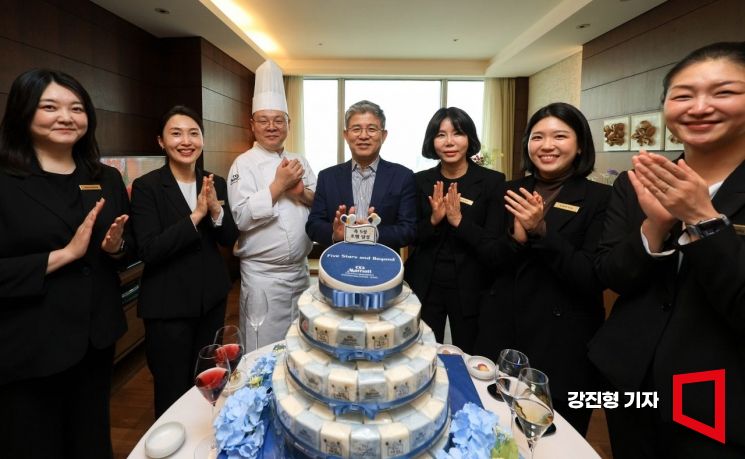 현상순 아시아경제 회장과 호텔 임직원들이 24일 서울 메리어트 이그제큐티브 아파트먼트 팬트하우스 스위트에서 열린 호텔 등급 5성 획득 기념 축하 이벤트를 마친 뒤 사진촬영 하고 있다.