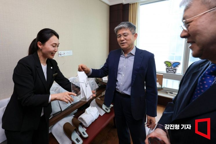 현상순 아시아경제 회장이 24일 서울 메리어트 이그제큐티브 아파트먼트 팬트하우스 스위트에서 열린 호텔 등급 5성 획득 기념 축하 이벤트에서 굿네이버스에 전달될 성금을 전달하고 있다.