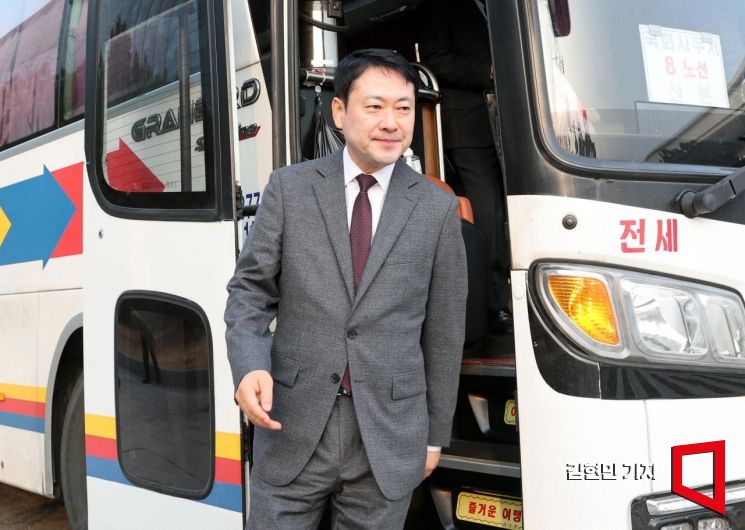중동 사태에 따른 에너지 절약 조치로 공공부문 승용차 5부제가 강화된 가운데 26일 장동혁 국민의힘 대표가 통근버스를 타고 국회로 출근하고 있다.