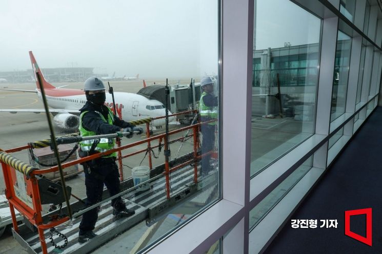 26일 인천국제공항 제1여객터미널에서 공항 작업자들이 봄을 맞아 청사 외벽 물청소를 하고 있다. 2026.3.26 강진형 기자