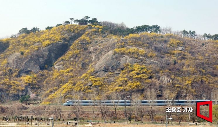서울 낮 기온이 19도 이상 오르며 봄기운이 무르익어가고 있는 가운데 26일 개나리 축제를 하루 앞둔 응봉산을 물들인 개나리꽃 아래로 기차가 지나가고 있다.