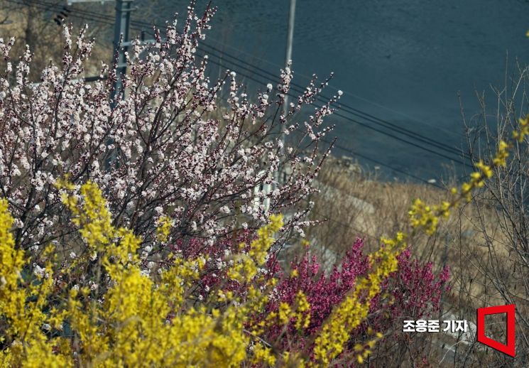 서울 낮 기온이 19도 이상 오르며 봄기운이 무르익어가고 있는 가운데 26일 개나리 축제를 하루 앞둔 응봉산에는 매화, 개나리 등 봄꽃들이 활짝 피어 나들이객을 유혹하고 있다.