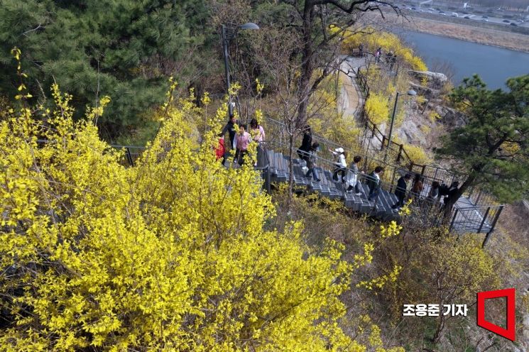 서울 낮 기온이 19도 이상 오르며 봄기운이 무르익어가고 있는 가운데 26일 개나리 축제를 하루 앞둔 응봉산을 찾은 나들이객들이 활짝 핀 개나리를 보며 봄을 즐기고 있다.