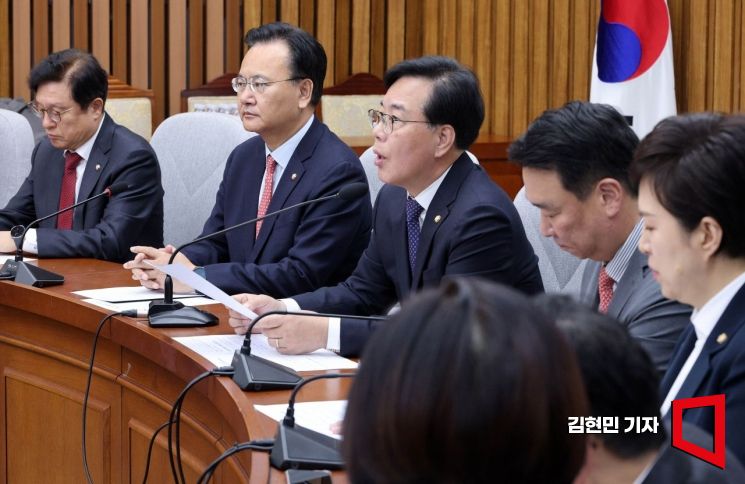 송언석 국민의힘 원내대표가 31일 국회에서 열린 원내대책회의에서 발언하고 있다.