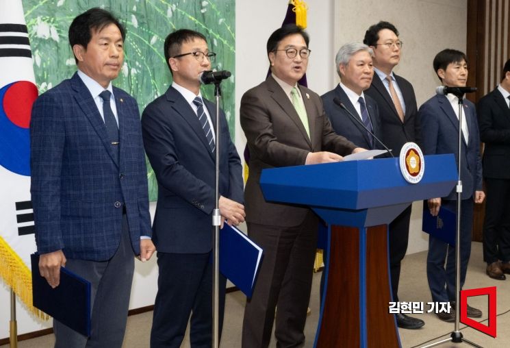 우원식 국회의장이 31일 국회에서 열린 초당적 개헌추진을 위한 제정당 원내대표 기자회견에서 인사말을 하고있다. 왼쪽부터 윤종오 진보당 원내대표, 한병도 더불어민주당 원내대표, 우원식 국회의장, 서왕진 조국혁신당 원내대표, 천하람 개혁신당 원내대표, 한창민 사회민주당 당대표.