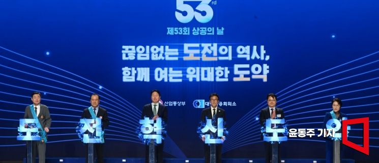 31일 서울 중구 대한상의에서 '제53회 상공의 날' 기념식이 열렸다. 금탑산업훈장을 받은 이종훈 인천도시가스 회장(왼쪽부터), 유니테크 이성호 회장, 최태원 대한상의 회장, 김민석 국무총리, 문신학 산업부 차관, 윤혜섭 다인정공 회장이 퍼포먼스를 하고 있다.