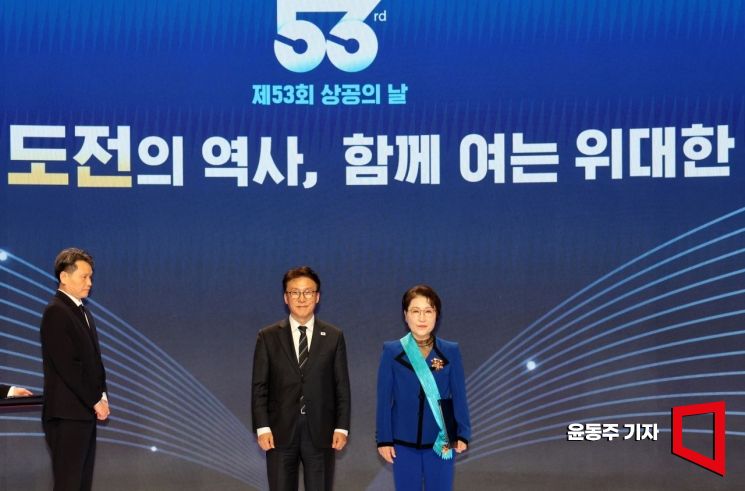 31일 서울 중구 대한상의에서 '제53회 상공의 날' 기념식이 열렸다. 금탑산업훈장을 받은 (주)다인정공 윤혜섭 회장이 수상후 김민석 총리와 기념촬영을 하고 있다.