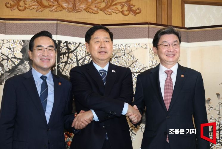 박홍근 기획예산처 장관(왼쪽부터)과 구윤철 부총리 겸 재정경제부 장관, 이억원 금융위원장이 1일 서울 종로구 정부서울청사에서 열린 거시재정 금융간담회에 앞서 손을 맞잡고 기념촬영을 하고 있다.