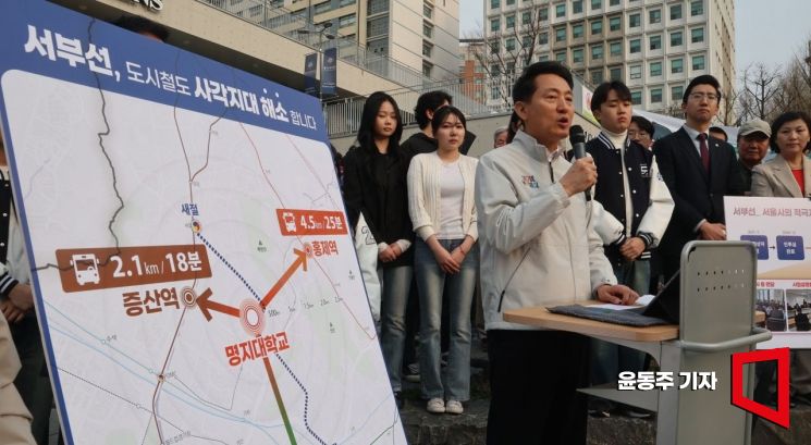오세훈 서울시장이 1일 서울 서대문구 명지대 앞에서 '서부선 도시철도 사업 현황'에 대해 주민들에게 설명을 하고 있다.