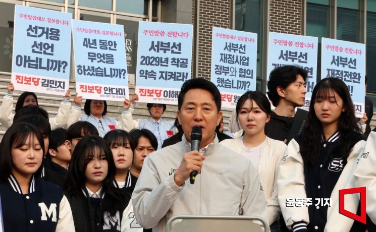 오세훈 서울시장이 1일 서울 서대문구 명지대 앞에서 '서부선 도시철도 사업 현황'에 대해 주민들에게 설명을 하고 있다. 오 시장 뒤로 진보당 당원들이 서부선과 관련한 플랫카드를 들고 있다.