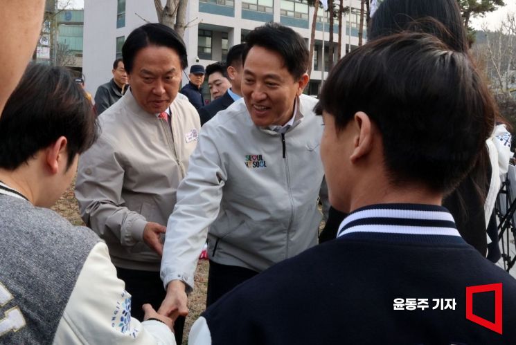 오세훈 서울시장이 1일 서울 서대문구 명지대 앞에서 '서부선 도시철도 사업 현황'에 대해 브리핑을 마치고 명지대 학생들과 인사를 나누고 있다.